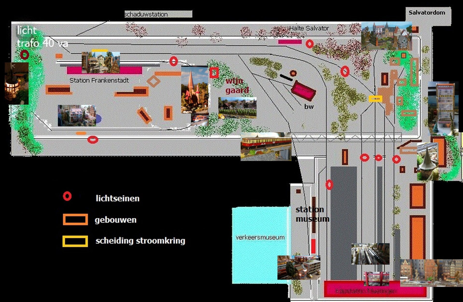 Boven: Plattegrond en Panorama. De baan staat op houten schragen. Er is een kopstation wat het stadje Muelingen bedient, een klein station in het vestingstadje Frankenstadt en een halte in de historische wijk Salvator. Verder een primitief schaduwstation voor het interregionaal verkeer!